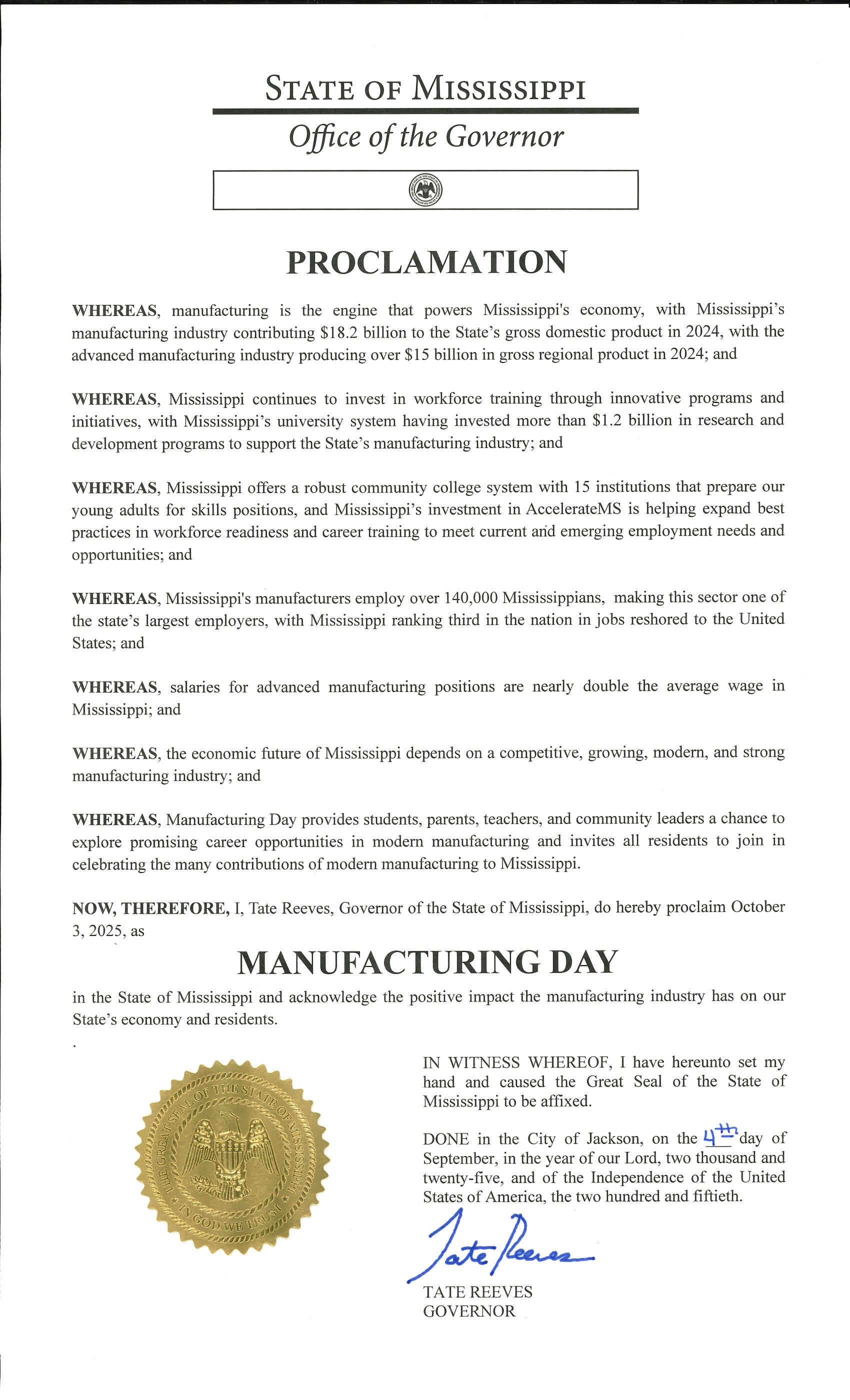 JACKSON, Miss. – Governor Tate Reeves proclaimed today “Manufacturing Day in Mississippi”, joining the national celebration organized by the National Association of Manufacturers (NAM). The day highlights the vital role of manufacturing in America’s economy and promotes exciting career opportunities for the next generation.